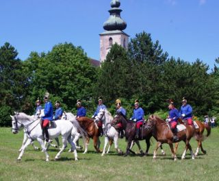 Zum Abschluss der Reitvorführungen lud die malerische Kulisse mit der Basilika St. Laurent im Hintergrund zu einem Gruppenfoto mir den uniformierten Zuschauern ein.