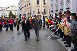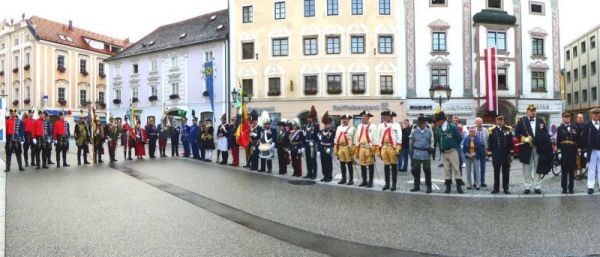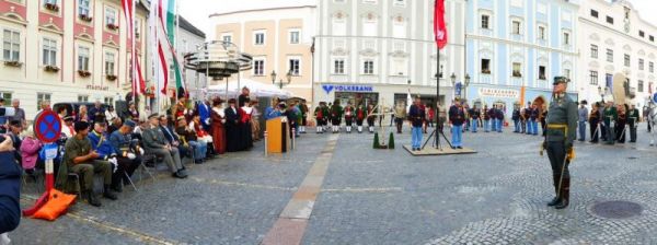 Nachdem zunächst heftiger Gewitterregen dazu zwang, den für 18:30 Uhr geplanten Festakt zum 100. Regiments-Gedenktag um eine Stunde zu verschieben, erstrahlte der Hauptplatz pünktlich zum Aufmarsch der wehrhistorischen Gruppen wieder im abendlichen Sonnenschein.