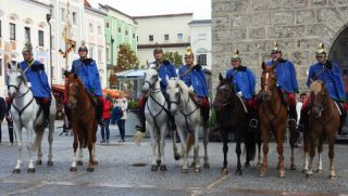 Nachdem die im Carré aufmarschierten Abordnungen der wehrhistorischen Gruppen den Hauptplatz am Stadtamt gesäumt hatten ritten die gastgebenden Dragoner vom Dragonerregiment Nr. 4 Kaiser Ferdinand ein und schlossen die Reihen der Ehrenformation am Stadtturm.