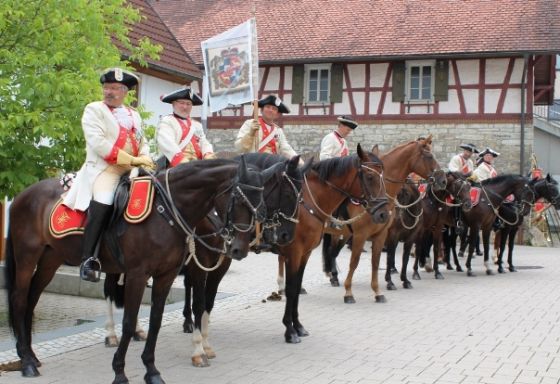 Pünktlich um 12:00 Uhr trafen die 5 Transportgespanne aus Herbertingen und Pault mit 10 Pferden am hierzu reservierten Sattelplatz beim Feuerwehrhaus in Gammertingen ein. Da die Pferde ja bereits zuvor in den Stallungen schon auf Hochglanz gebürstet zum Anreiten der Gammertinger Verstärkung gegen 12:30 Uhr bereits gesattelt waren, traf die Abteilung, noch mit 2 Täfeleträger zu Fuß verstärkt, überpünktlich am nahe gelegenen Aufstellungsplatz ein.
