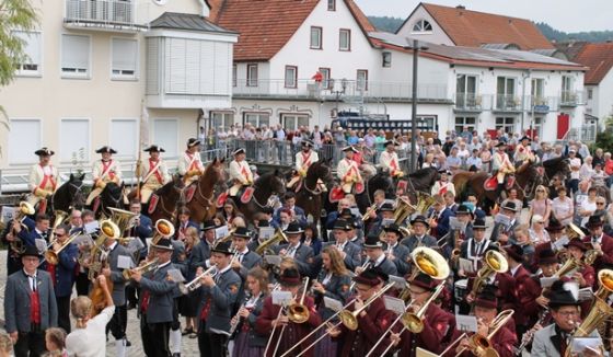 Auch wenn von dort der Rückweg zum nahe gelegenen Sattelplatz der Hohenzollern-Kürassiere zunächst versperrt war und diese somit den traditionellen Fahneneinmarsch knapp verpassten, hatte die Musikkapelle Hohentengen die Stimmung im Festzelt bereits soweit angeheizt, dass die heiße Festwurst und das kühle Bier umso mehr schmeckten.